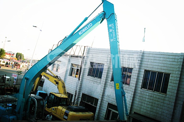 加長臂:加長臂是我們最常見,使用時間更早的大小臂加長臂,不需要伸縮缸控制。它通過大臂、小臂同時加長,配帶小挖斗,擴大機械的工作范圍。